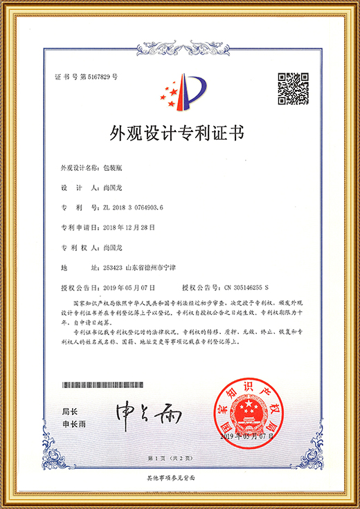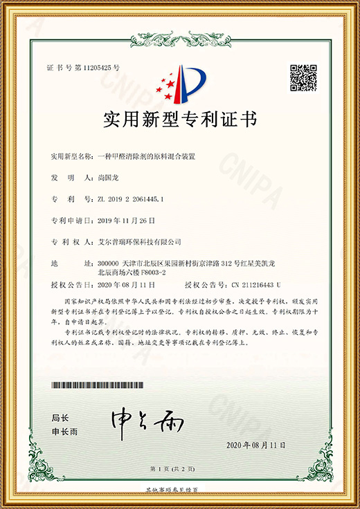 • 實(shí)用新型專利證書(一種甲醛清除劑的原料存儲(chǔ)